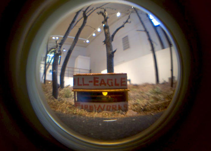 PVC pipe, roofing paper, found objects; 5.1 surround sound video; additional audio