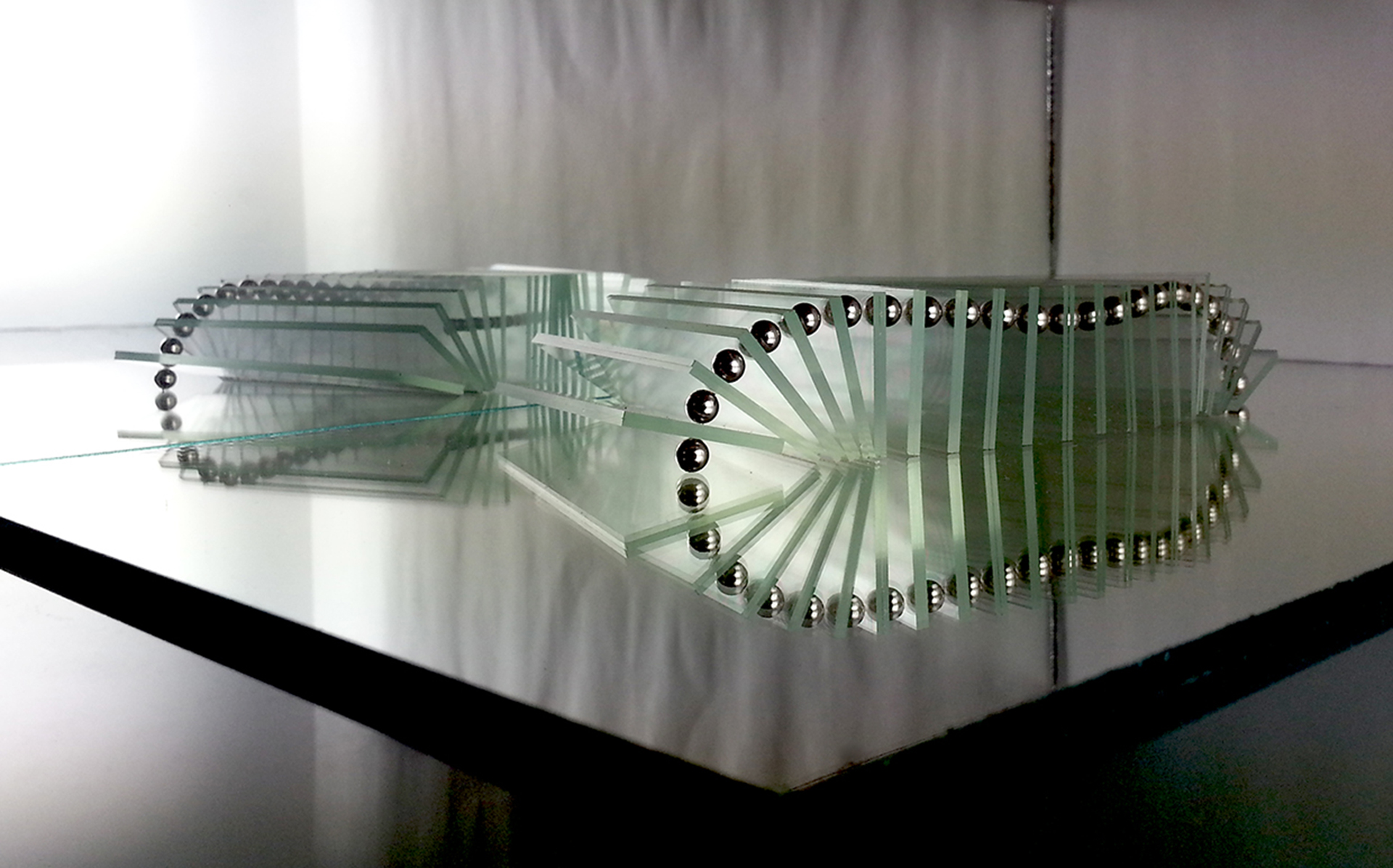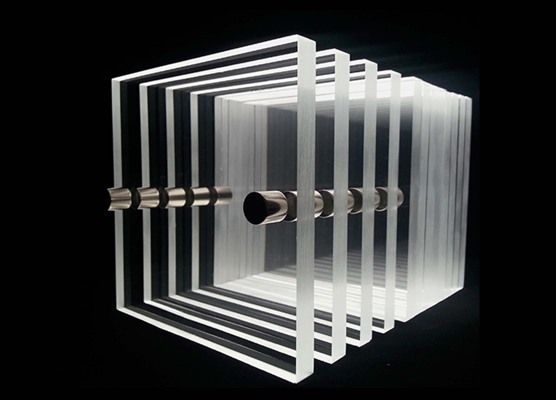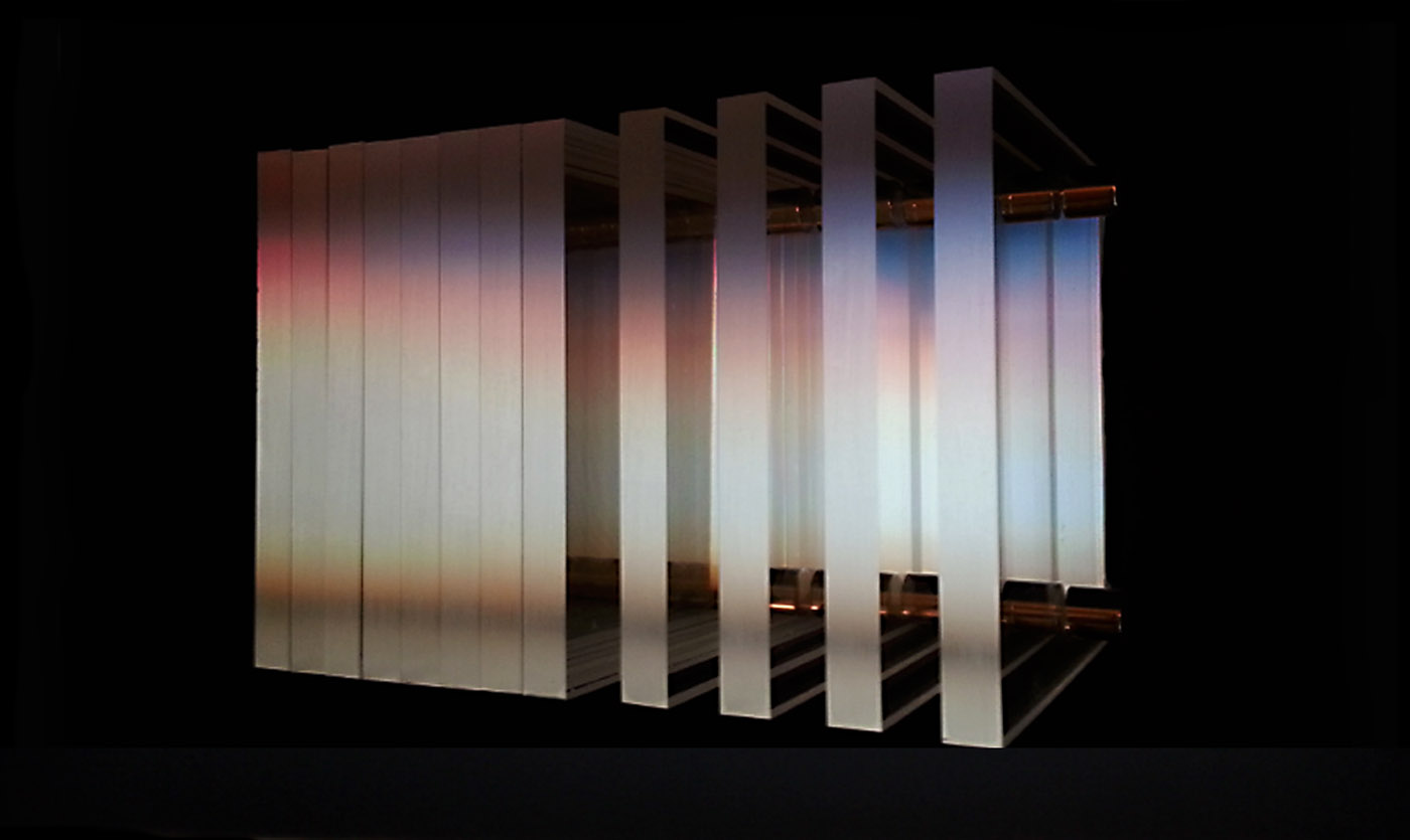 This piece is part of a series investigating nonlinear time and space. Concatenated layers of translucent plexiglass describe slices in a region of space-time; conducting video through it provides a way of thinking about events in that region (see it in action in Resonant Luminance).